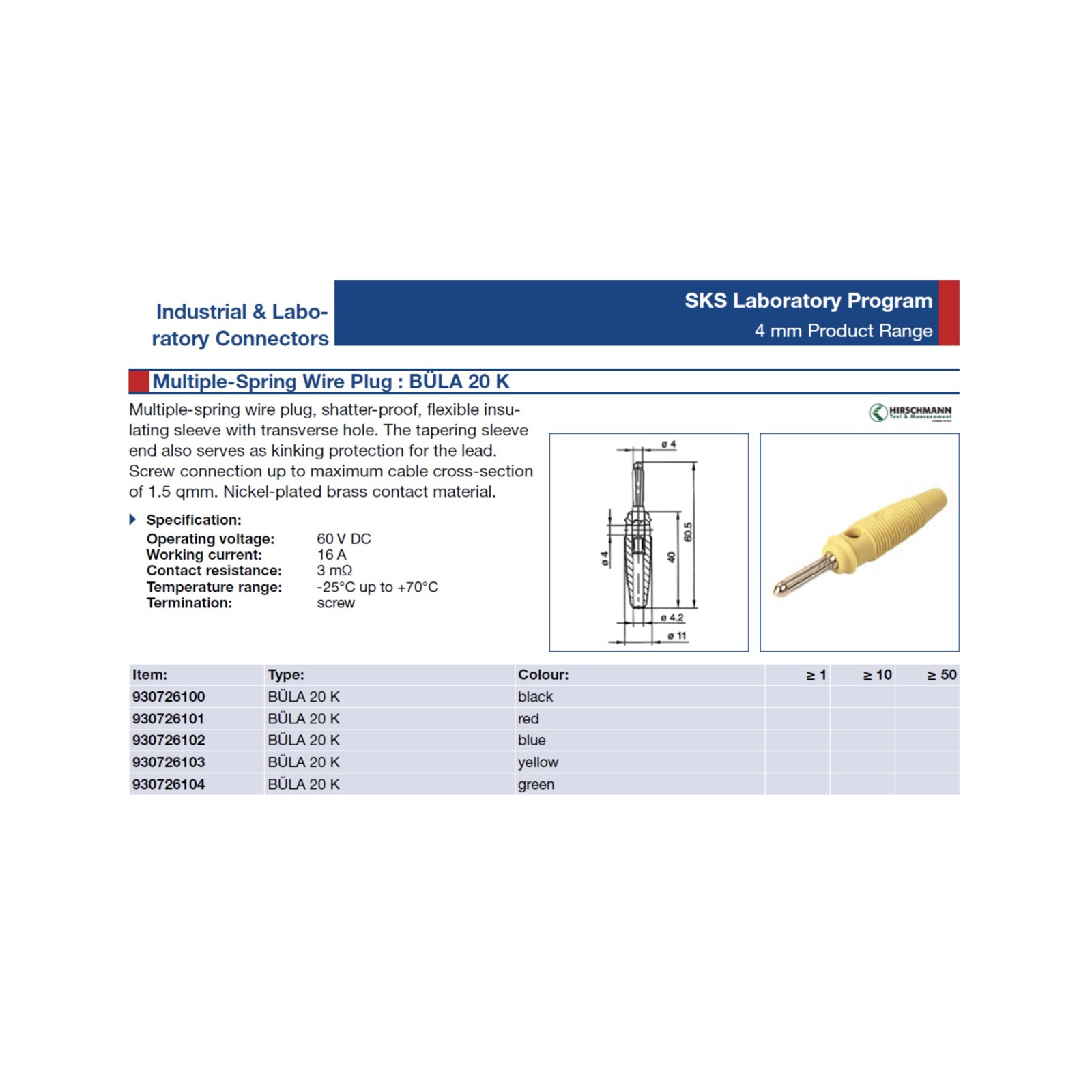 1 X HIRSCHMANN BÜLA 20K AMR BLUE MALE 4mm BANANA PLUG.